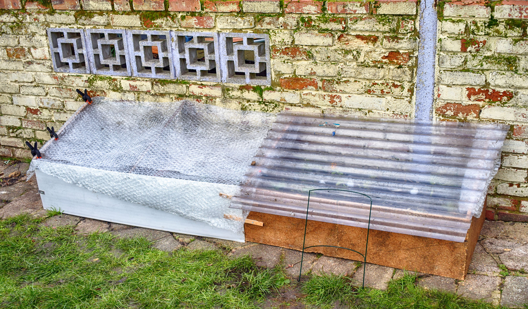 Bene, ho ancora delle piante che soffrono il freddo, proviamo a costruire un secondo cold frame (a sinistra nella foto). Avevo quasi esaurito il compensato, per cui mi sono appoggiato al contenitore che avevo già costruito, in modo da avere solo due pareti da tirare su: una in compensato e l'altra, quella davanti, in PVC bianco, fissata tramite due staffe di legno al "vicino". Orribile, eh? Non importa, purché riesca ad isolare le mie piante dal gelo. Di PVC trasparente non ne avevo più, quindi ho utilizzato l'unica cosa trasparente che avevo in casa: il pluriball, la plastica da imballo con le bollicine. Non era larga a sufficienza per coprire tutta la superficie, quindi ho dovuto utilizzare due strati parzialmente sovrapposti, cosa che mi ha fatto subito dubitare: il tetto del cold frame dev'essere trasparente per fare passare più luce possibile in inverno, ma due strati di pluriball bloccano parecchio. E non e' che sia facile fissarli...