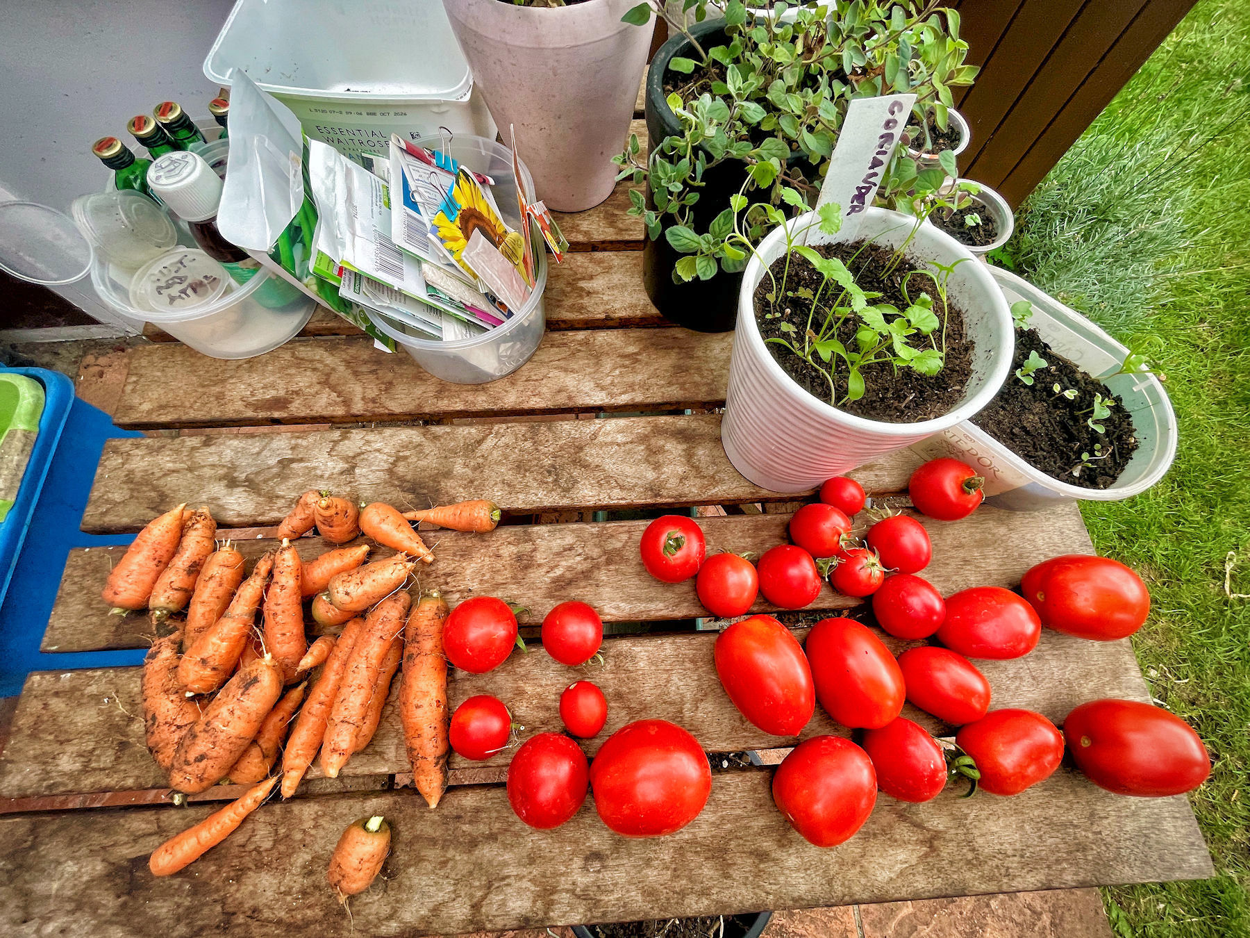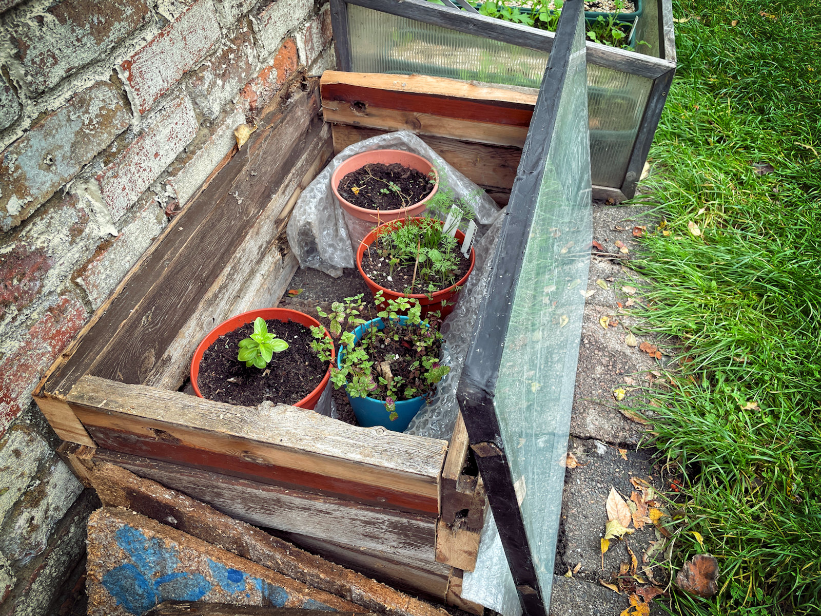 8) erbe, nota dolente: vorrei che sopravvivessero all’inverno, ma è improbabile: qui in Inghilterra si dà per scontato che basilico, aneto e coriandolo debbano essere piantate ex novo ogni anno. Vedi punto 5: vorrei fare in modo (a costo zero o quasi) di tenere queste piantine al caldo;